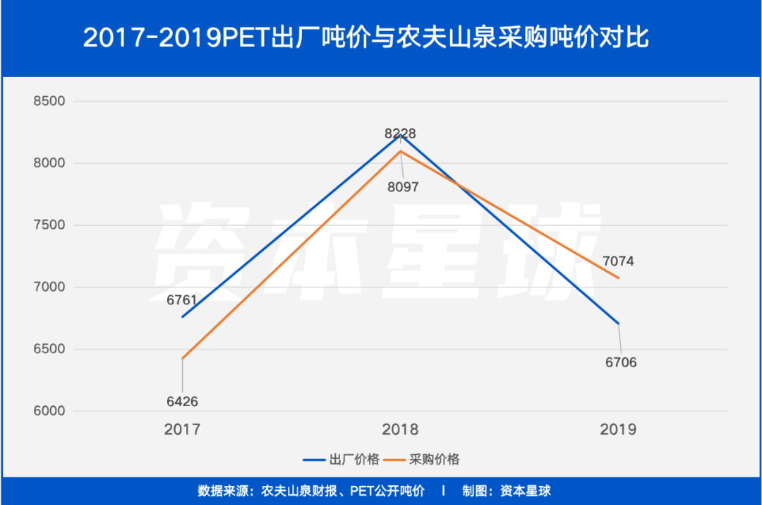 从图中可以看出,2017年PET平均出厂价格为6761元/吨,此时农夫山泉采购PET的价格为6426元/吨,其仅为前者的95%左右;此后这一落差逐渐缩小,到2019年,PET平均出厂价格为6706元/吨,相比两年前已有所降低,而此时农夫山泉采购PET的价格却涨到7074元/吨,是平均出厂价格的105%。