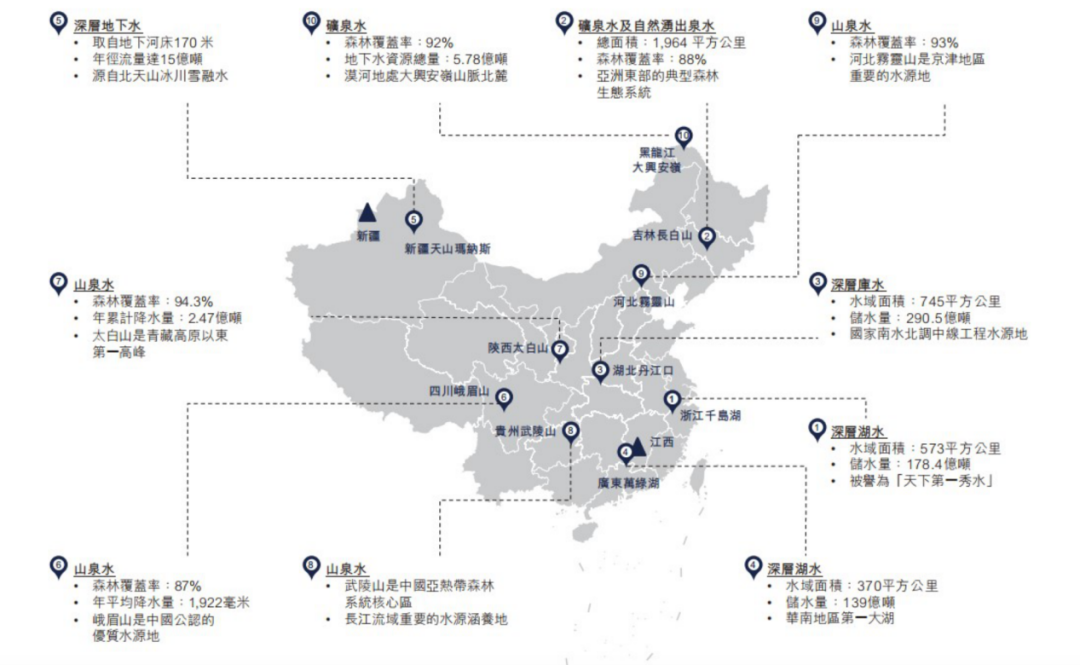 作为“大自然的搬运工”,农夫山泉在全国拥有十处水源。从地图来看,这十处水源分布较均匀,涵盖长白山、千岛湖、丹江口等重点生态保护地区。