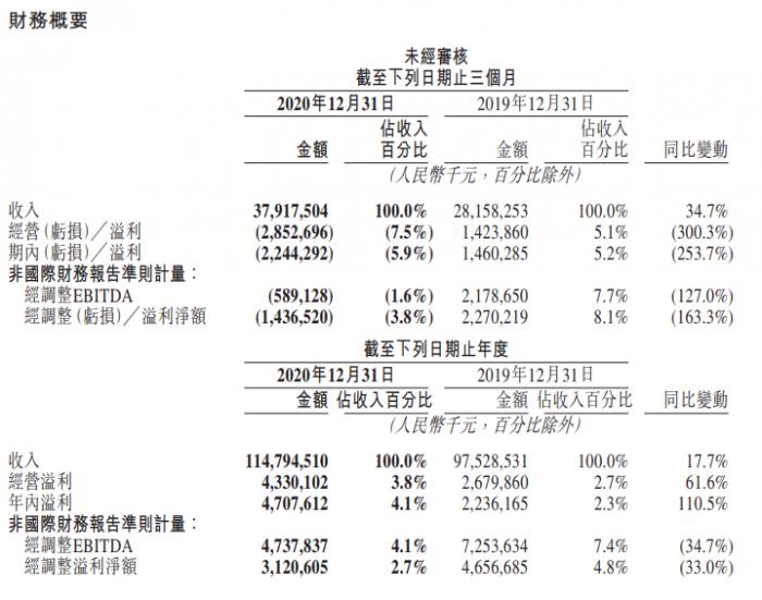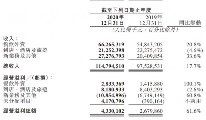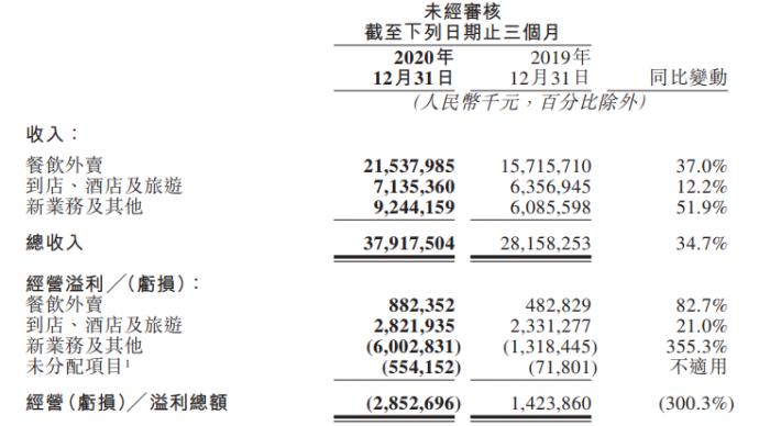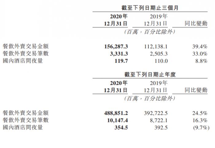 2020年第四季度,餐饮外卖业务交易金额同比增长39.4%至人民币1563亿元。餐饮外卖日均交易笔数同比增长33.0%至36.2百万笔。每笔餐饮外卖业务订单的平均价值同比增长4.8%至人民币46.9元。餐饮外卖业务变现率由2019年同期的14.0%降至13.8%。