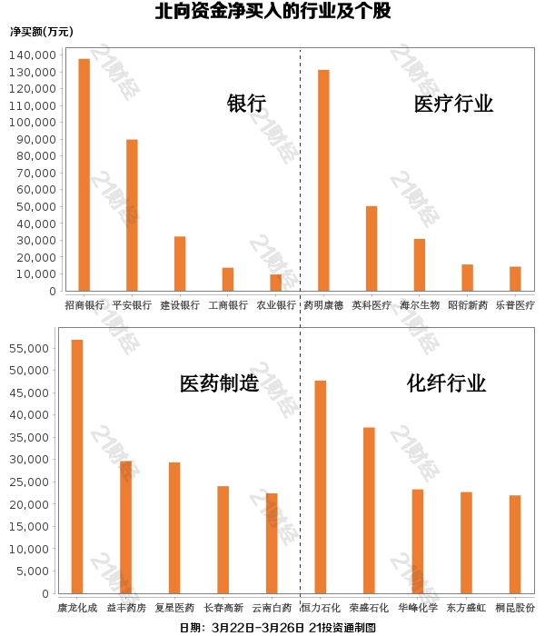 从净买入金额来看,北向资金增持了36个行业,其中银行居首,净买入金额达22.42亿元,其次是医疗行业,净买入20.95亿元。