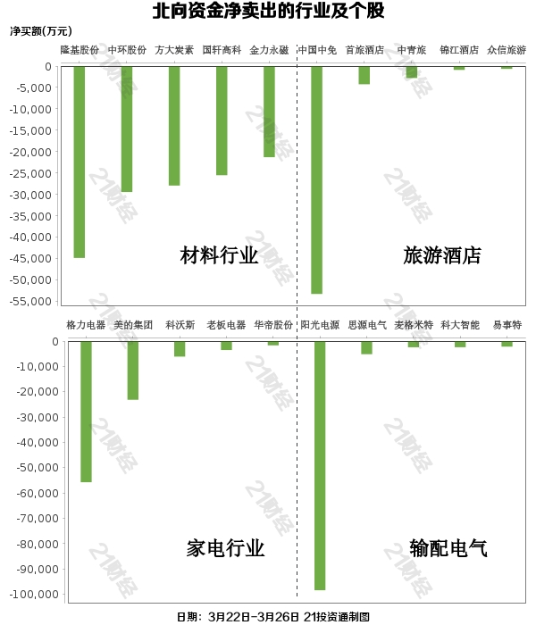 北向资金减持了24个行业,其中材料行业最多,净卖出金额达11.16亿元,其次是旅游酒店行业,净卖出5.77亿元。