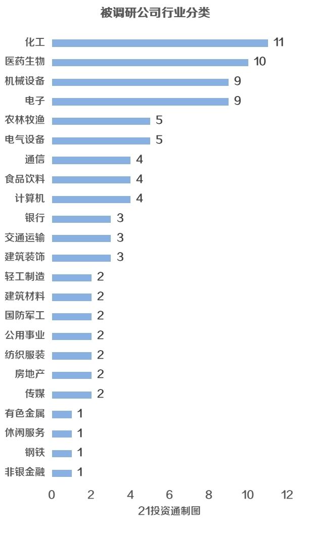 从行业分布来看,化工行业依旧最受机构青睐,共有11家相关公司被调研,包括:金宏气体(688106.SH)、纳尔股份(002825.SZ)、云图控股(002539.SZ)、飞凯材料(300398.SZ) 等。