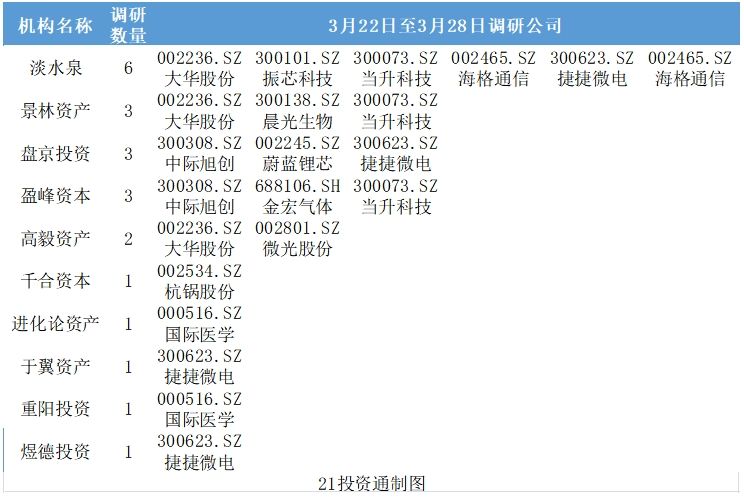 当周机构调研热情提升。据21投资通(微信号ID:touzit21)统计,3月22日至3月28日共计88家上市公司获得机构调研,环比增加21家。