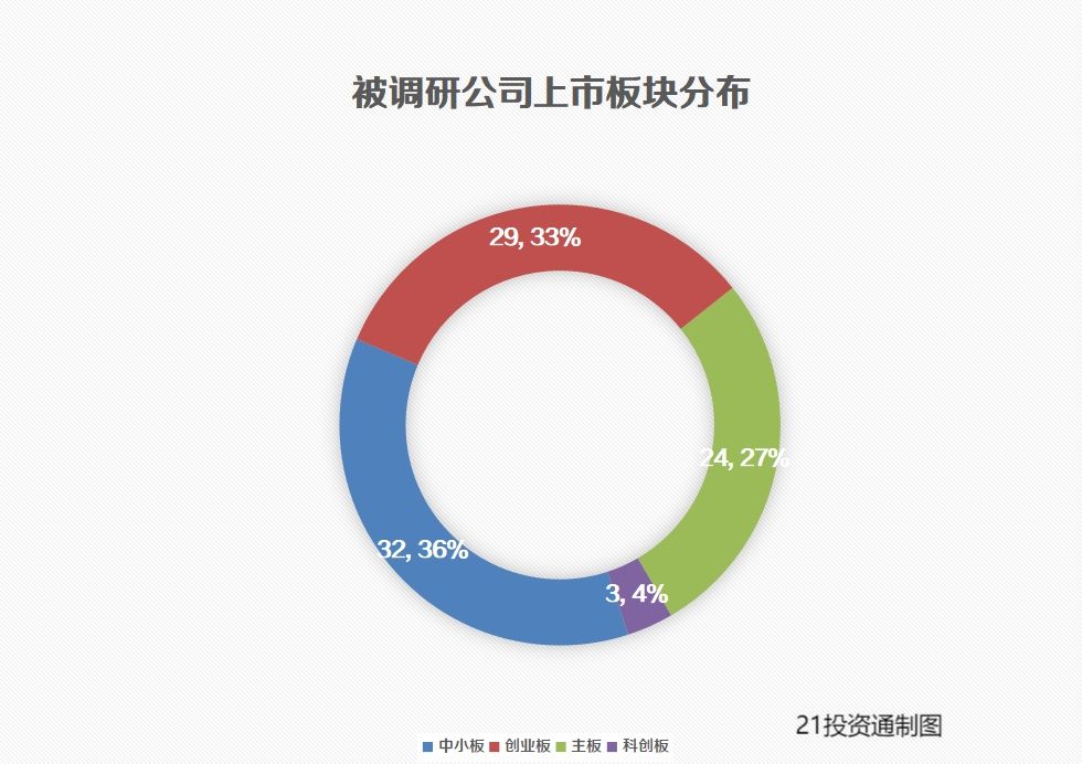 据21投资通统计显示,被机构调研的这88家公司中,属于中小板的有32家,属于创业板的有29家,科创板企业3家,另外24家来自主板。中小创占比约69%。