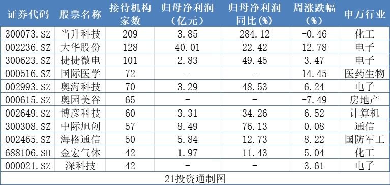 从公司来看,有34家公司获10家以上机构调研,其中,当升科技(300073.SZ)、被209家机构扎堆调研。大华股份(002236.SZ)、捷捷微电(300623.SZ)分别获128家、101家机构的青睐。