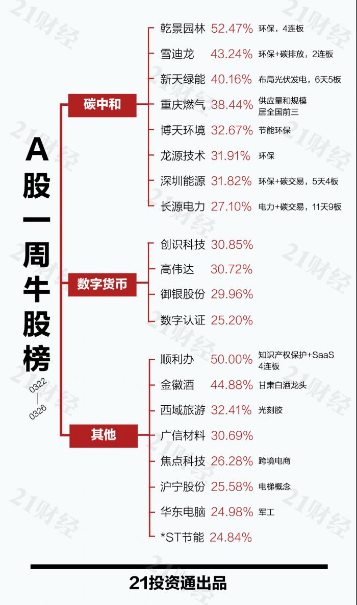 最牛股乾景园林一周实现4连板,主要受益于园林开发和碳中和概念。公开资料显示,乾景园林参股联营公司汉尧环保,持股25%,主营高耗能高污染行业节能环保相关业务。虽然公司3月24日发布风险提示,静态市盈率绝对值为205.02倍,高于行业同期水平,但并未阻挡公司继续连板。