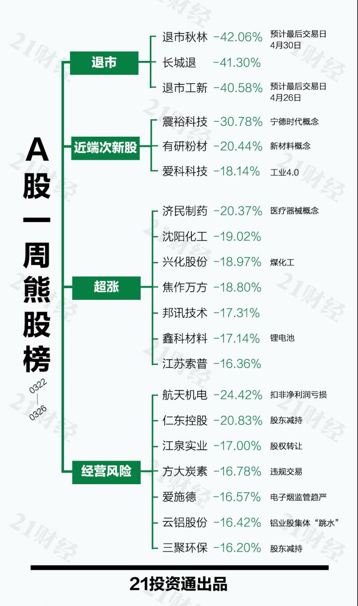 当周,再增退市秋林(600891.SH)和长城退(002071.SZ)两家退市公司。退市秋林(600891.SH)已连续6个交易日跌停,成为本期最熊股,股价报收于0.62元/股,市值仅剩3.8亿。