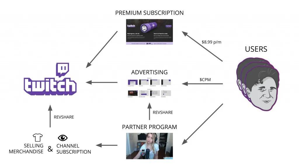 游戏直播平台Twitch设有从4.99刀到24.99刀的不同档位订阅,让粉丝可以花钱以获得某些频道的专属emote、跳过广告、加入独家聊天室等特权,目前在平台上的200万播主中,有30万左右的人都加入了Twitch的伙伴或大使项目,播主也可以直接分享链接求打赏。