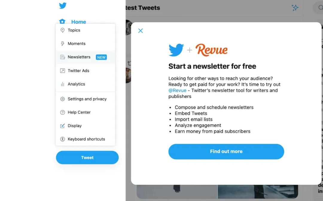 虽然目前Twitter用户还要额外注册Revue账号,但Twitter已经将Revue加入到了菜单栏中的“帮助发现”。