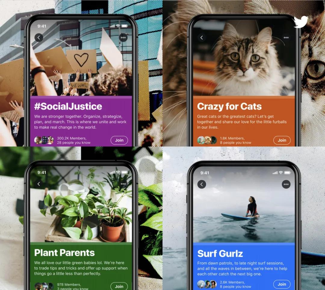 Twitter同时还推出了群组功能Communities,用户可以加入以不同兴趣和主题划分的群组,像是冲浪、养花、爱猫等等,说白了就是微博群组的概念,“正面对刚”对Facebook至关重要的Group功能,这让刚加入Twitter的新用户在如大海般的平台上更有方向开始,也能够在长期加强用户粘性。