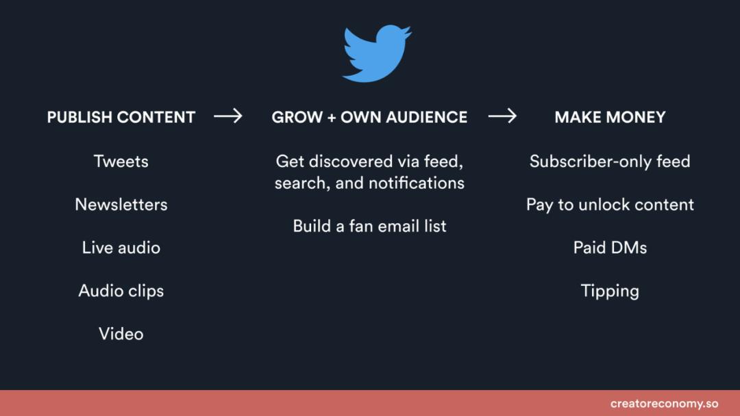 畅想一下,一位Twitter KOL可以先在Twitter上发布一条干货满满的推送或是新闻简讯,继而可以通过语音聊天群或者是持续更新新闻简讯的方式不断增长用户,而最新的付费内容功能则让他们能将智慧变成银子,形成发现-涨粉-盈利的网红经济闭环,比起Instagram和YouTube,Twitter上更多一些“知识分子”式的内容创造者,这样的模式也更合适。