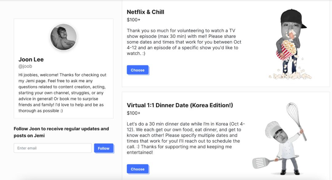比如去年夏天刚刚创立的Jemi让网红们可以随心所欲的“售卖自己”,从签名周边到视频聊天,再到视频喊话…