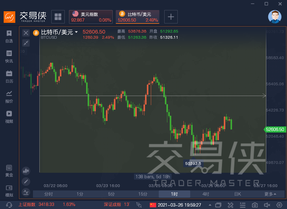 比特币本周震荡下行,特斯拉允许用比特币付款的消息只是短暂提振了比特币,比特币在周四险些失守50000美元大关,随后小幅回升,目前在52000美元上方徘徊。
