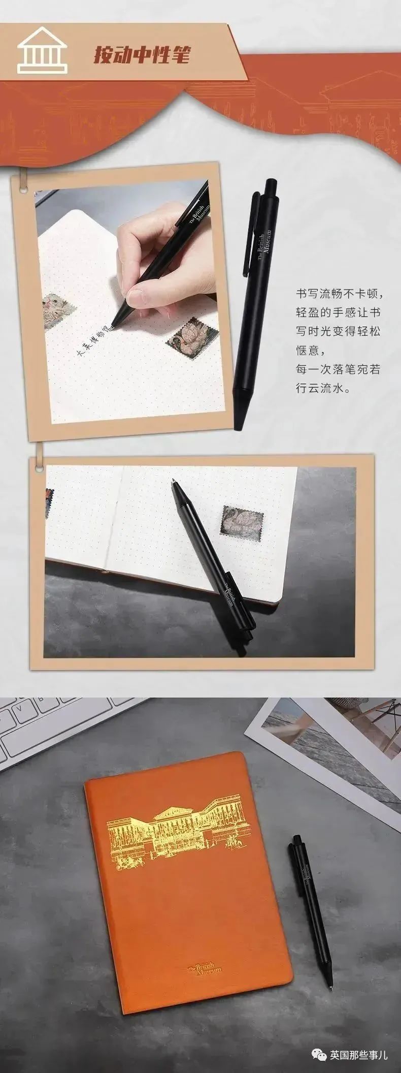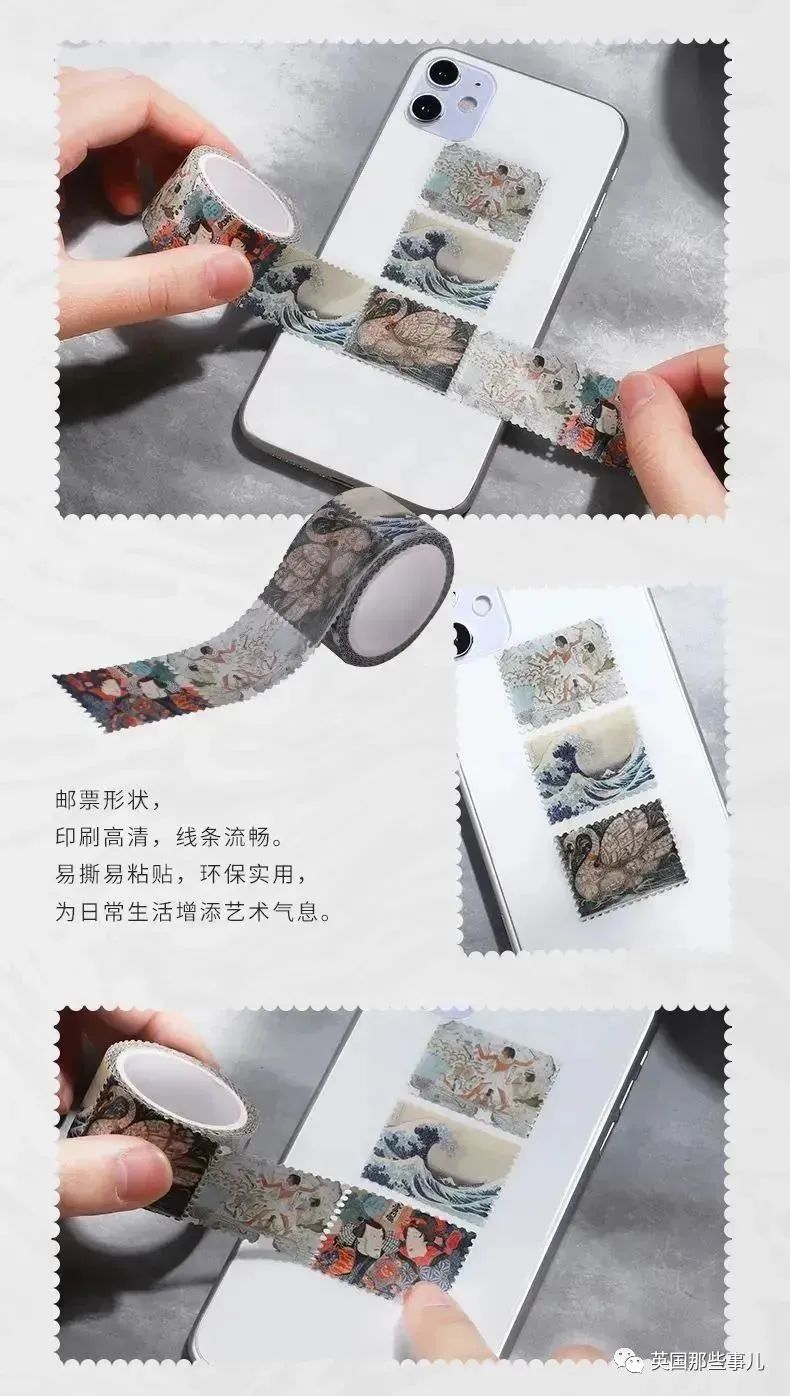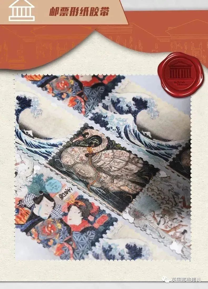套装中还有大英博物馆官方纹理徽章、一格一幅画作的邮票纸胶带、博物馆官方中性水笔