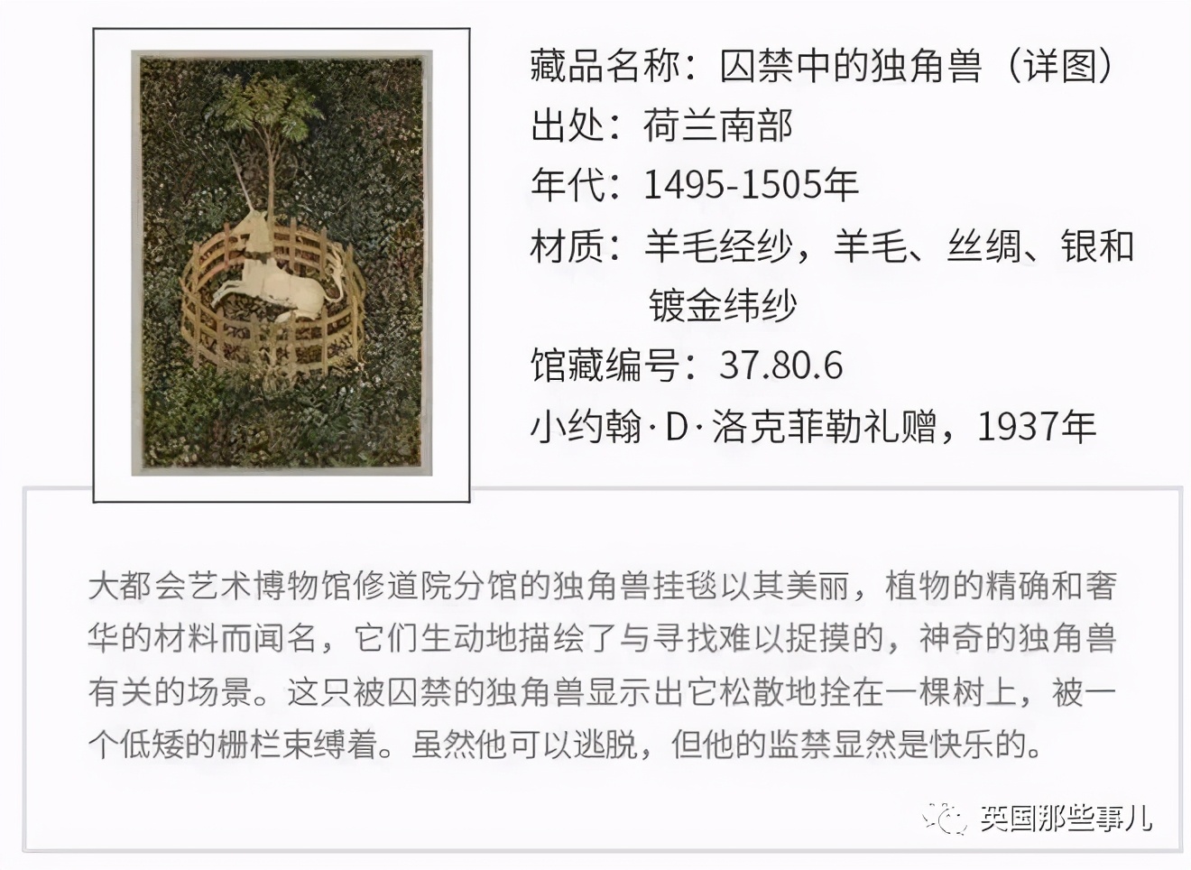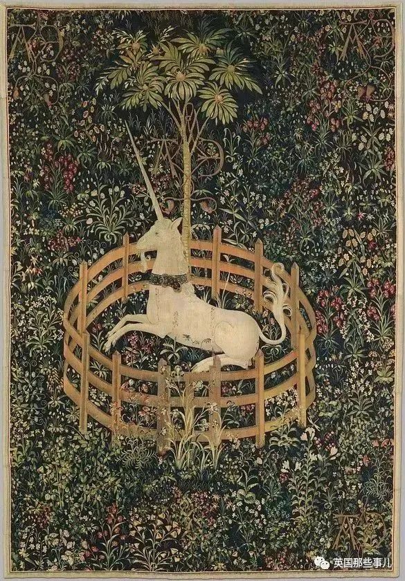 中世纪的欧洲,织毯是最昂贵的装饰,尊贵的象征,特别是那么一副3.68米*2.52米,由羊毛、丝绸、银线和金线组成、由5个左右编织工人花整整一年时间手工制成的织毯。这条织毯后由洛克菲勒赠予大都会艺术博物馆。