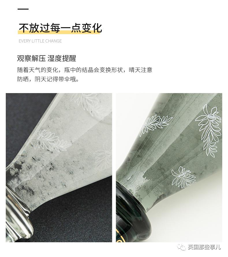 风暴瓶是一种可能的天气预报工具。密闭的玻璃容器中,装入溶液。根据外界温度改变,瓶内会展现出不同型态的结晶。