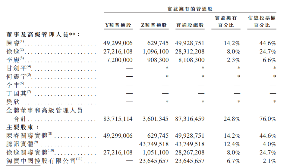 目前,B站采用ZY股双层投票权结构(每股Z类普通股有1票表决权,每股Y类普通股有10票表决权)以保证核心管理层对公司的控制权。最新招股书显示,创始人徐逸、董事长兼CEO陈睿及副董事长兼COO李旎三人拥有所有Y股股权。陈睿合计持股14.2%,投票权高达44.6%。