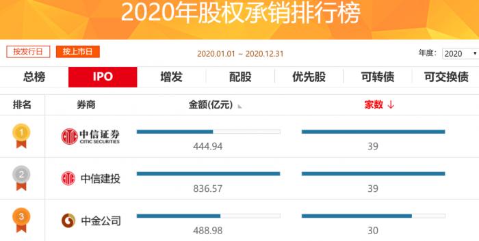 2020年IPO承销排行榜前三名