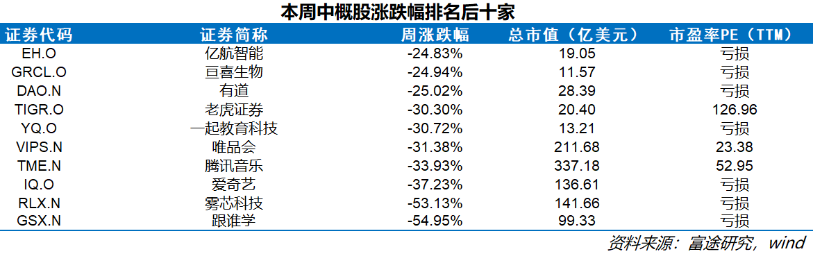 1、本周美国中概股中大量亏损企业大幅下跌,其中跟谁学、雾芯科技均受政策端影响导致股价大幅下跌。