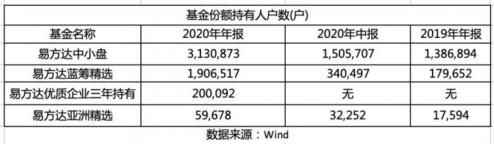 年报数据显示,张坤管理的基金持有人总数接近530万户,其中易方达中小盘基金持有人313万,易方达蓝筹精选基金持有人191万,易方达优质企业三年持有投资人20万,易方达亚洲精选投资人6万。