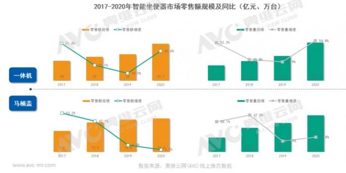 奥维云网(AVC)数据显示,2020年智能马桶零售量额双增,其中智能一体机零售额33.7亿元,同比增长40.6%,零售量104.6万台,同比提升54.8%;智能马桶盖零售额达15.2亿元,同比提升3.1%,零售量100万台,同比提升26.8%。