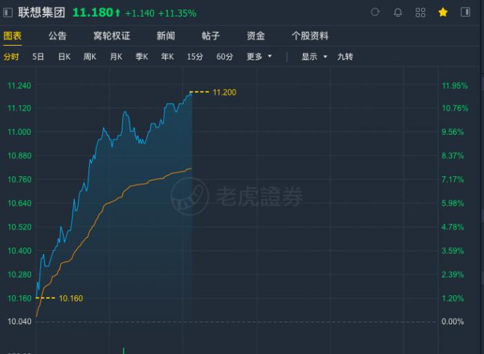联想股价上涨11.35%至11.20港元 创2015年6月以来新高