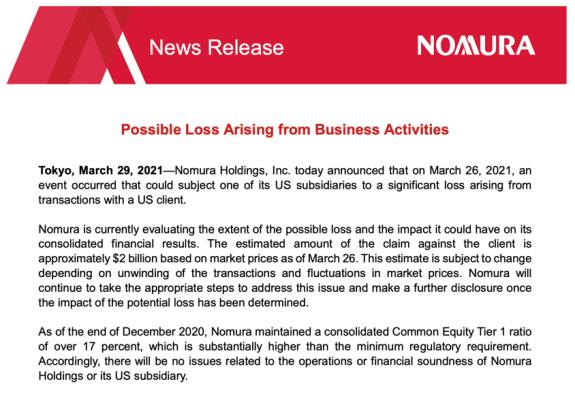 3月29日,野村控股公司发布公告称,公司和一位美国客户的交易可能使得美国公司遭受显著亏损,根据3月26日(上周五)的市场价格估算,亏损额有可能达20亿美元(约折合人民币130亿元)。考虑到交易的进展和市场价格波动,亏损的准确金额有可能在上述估算数值上下波动。野村同时表示,这不会引发野村运营和财务方面的风险。