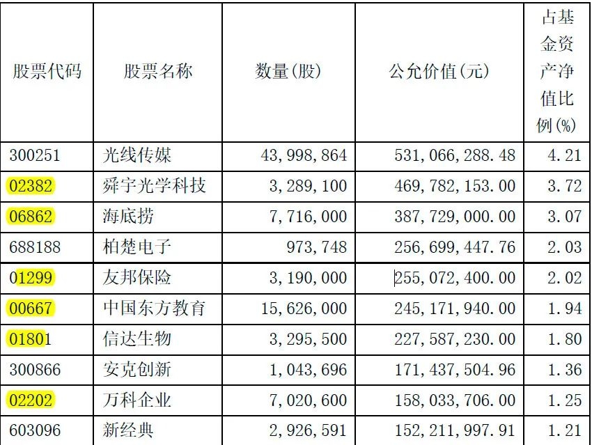 和去年年中相比,邬传雁下半年也加大了港股的配置,持有港股数量从8只增至10只,具体来看,进一步增持原有持仓颐海国际、舜宇光学科技、海底捞、友邦保险、中国东方教育、华兴资本控股等,信达生物、万科企业则是新进股票。