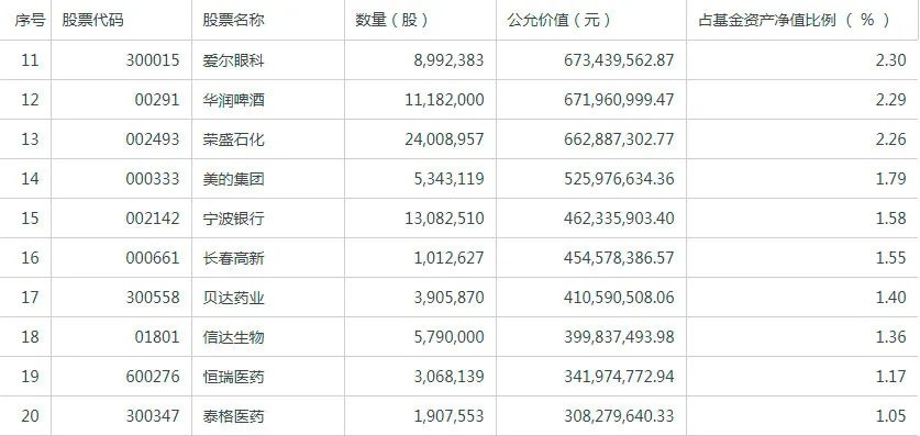 此前华兰生物连续多个季度成为易方达中小盘前十大重仓股,从去年三季度开始,华兰生物退出前十大重仓股,从基金2020年年报情况来看,张坤已所剩不多,虽然仍持有100万股,持股市值占基金资产净值比例为0.11%,去年张坤累计卖出华兰生物28.74亿元。