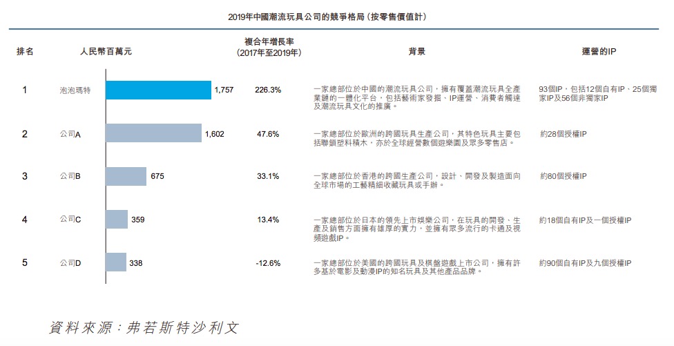 根据弗若斯特沙利文报告,中国潮流玩具零售的市场规模由2015年的63亿元增加至于2019年的207亿元,复合年增长率为34.6%,潮流玩具零售的市场规模预期于2024年达到763亿元。