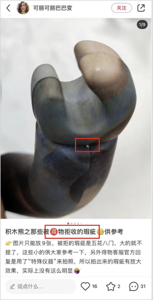 其次,由于需要长途运输,积木熊的材质也经不起磕碰,因此到手的熊会有各种“出厂瑕疵”。