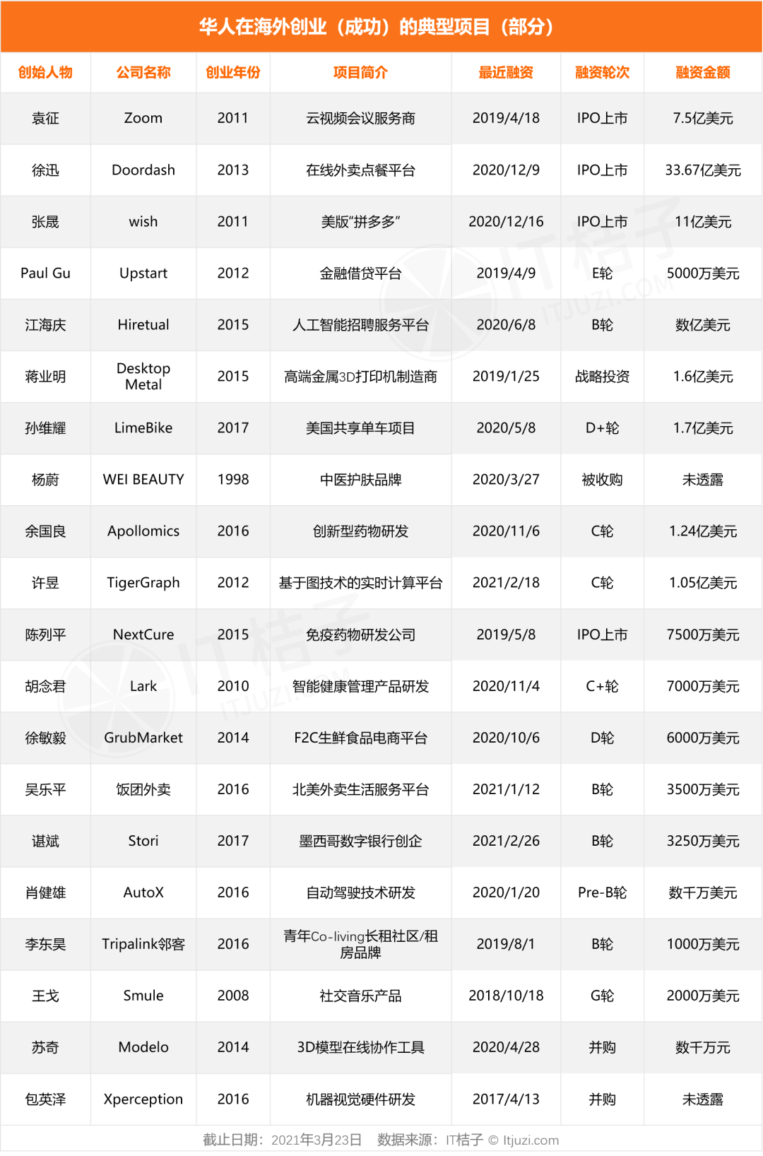 IT 桔子在此列出了十多家估值达到 1 亿美元以上,还有已上市或被收购的、发展较好的项目,仅供参考。(注:篇幅所限,更多人物简介、过往履历,可以在 IT 桔子人物库搜索并查看)