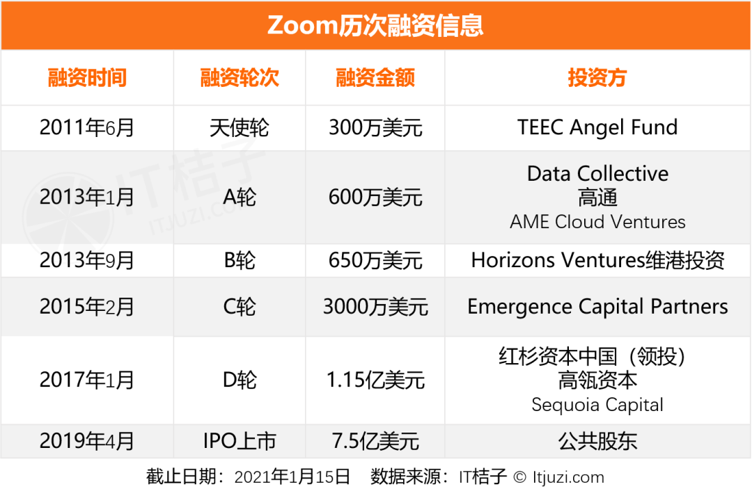 2011 年袁征离开思科,创办了在线云视频会议 SaaS 产品 Zoom——和他的前东家朱敏一样,袁征 40 多岁才开始创业,甚至创业方向也一样,但在模式上,一个做软件,一个做 SaaS。刚创业,Zoom 就拿到了 300 万美元的天使融资,此后 Zoom 基本保持每两年新融一轮的节奏,非常稳定,每一轮融资额也很合理——没有像国内在某一个「风口」期密集融资,且披露的融资额超高的情况。当然,这也与企业服务领域的行业特点相关。