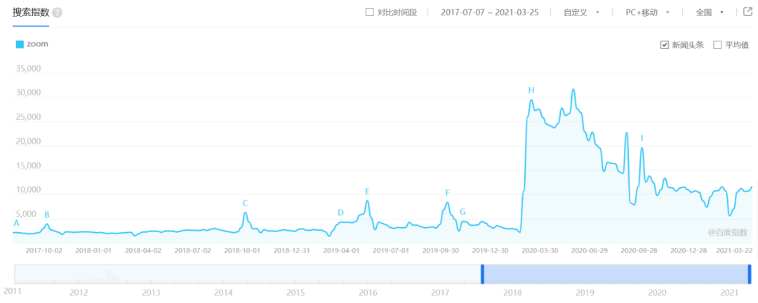 从 Zoom 最近 5 年的百度搜索指数可以看到非常明显的变化,Zoom 上市这个重大新闻基本没在国内溅起水花,只带来小范围影响;而 2020 年春节 Zoom 爆红,成为大众熟知的主流公司。