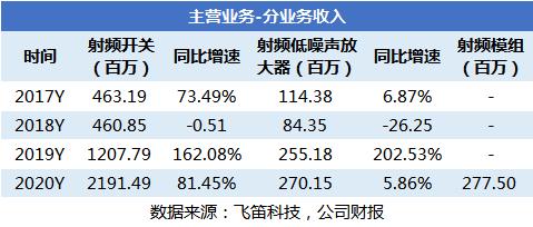 由上面的表格可以看到,2020年,卓胜微的射频开关产品收入为21.91亿元,增速为81.45%,继续维持高增长但增速有所下降;射频低噪声放大器,2020年实现收入2.7亿元,同比增长5.86%,增速下滑明显。此外,在2020年,卓胜微增加了射频模组2.78亿元的收入,占营业收入的13%。
