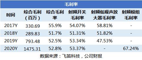 先看公司的毛利率情况。由上面的表格可知,自2017年以来,卓胜微的毛利率均维持在50%以上的高水平。2020年,公司毛利率为52.8%,表现稳定。分业务看,公司主要收入来源射频开关产品的毛利率较为稳定,2017年到2019年毛利率持续下滑的射频低噪声放大器业务的毛利率则没有公布,新业务射频模组的毛利率为67.24%,是毛利率最高的产品,但由于占比还小,对综合毛利率的提升效果不明显。