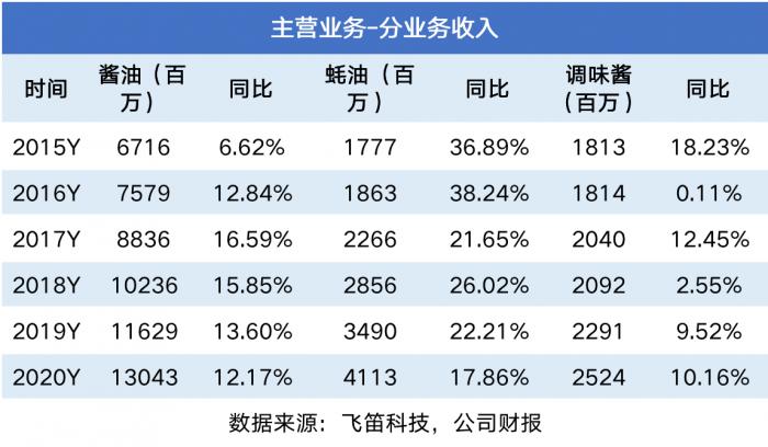 从上表可以看到,公司的酱油业务和蚝油业务表现都相对稳定,其中酱油业务增速跟过去五年接近。蚝油业务增速和过去五年的平均水平还有差距,但也有17.86%,依然是公司表现最好的一块业务。调味酱业务增速波动相对较大,2020年的表现也好于往年。