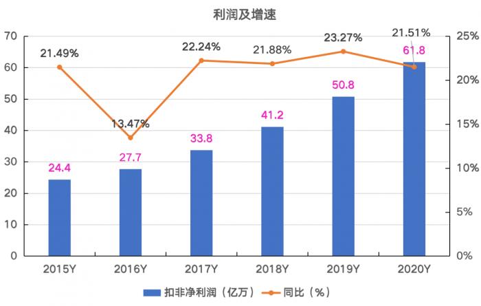 从上图还可以看到,公司的净利率缓慢但是稳定地在提升。从2015年的21.61%增长至2020年的27.12%。净利率的稳步提升解释了为什么公司的利润增速要持续好于收入的增速。