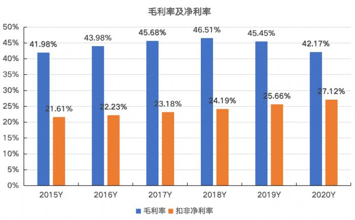 如果将公司2020年毛利率还原成跟此前年份相同的口径,2020年公司的毛利率约为45.37%,这意味着2017年以来,公司的毛利率一直维持在45%-47%的窄幅区间。