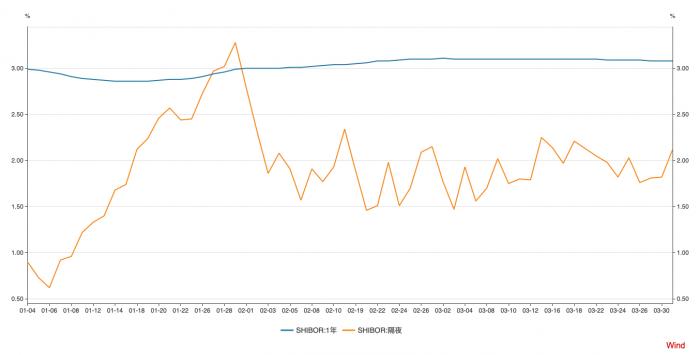 报价利率方面,本月长端利率整体企稳;短端利率整体上震荡下行,且振幅减弱。3月31日,隔夜SHIBOR报2.12%,较开年以来的高点3.25%下降了113个BP,整体上波动幅度收窄;同日1年期SHIBOR报3.08%,整体表现较为稳定。