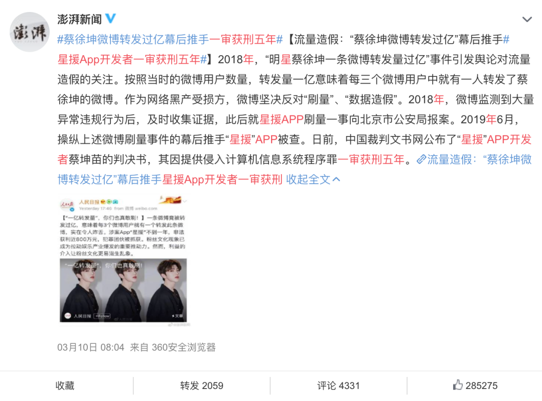 前阵子,2019年因曾经帮助蔡徐坤制造一亿微博转发量的幕后推手星援APP被查封,其创始人蔡坤苗也被判5年刑期。蔡坤苗提到,“2019年2月份查看后台数据,星援、应援宝共有微博‘大号’用户17余万个,这17余万用户大约绑定了3000余万个微博‘小号’。”