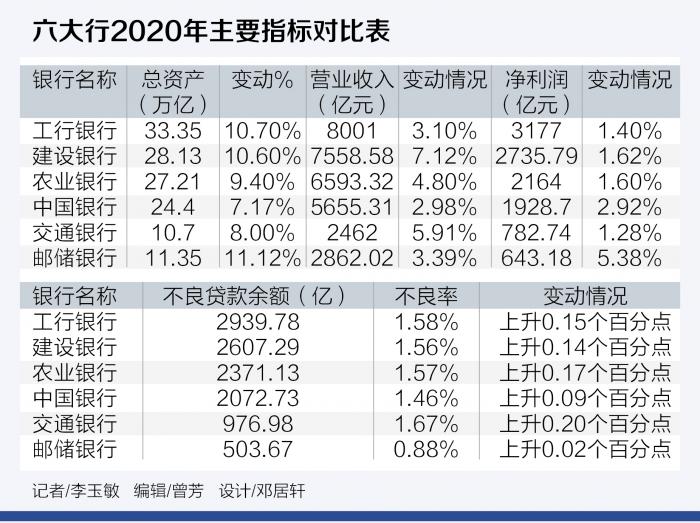 又到一年一度的年报季。据21世纪经济报道记者梳理,截至3月30日晚间,工行、建行、农行、中行、交行和邮储银行国有六大行悉数公布了2020年的业绩报告。