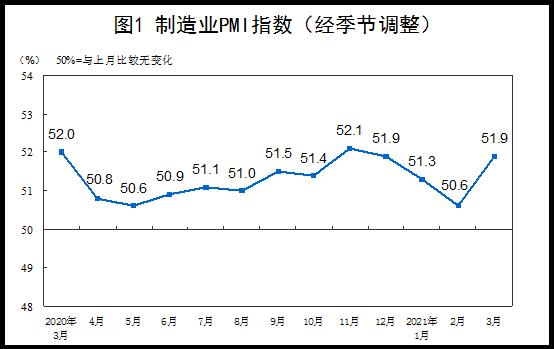 3月份,中国制造业采购经理指数(PMI)为51.9%,高于上月1.3个百分点,制造业景气回升。