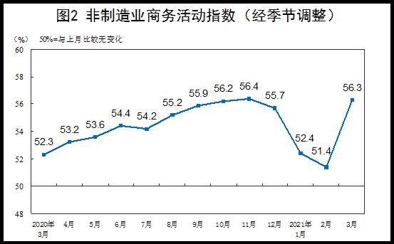 3月份,非制造业商务活动指数为56.3%,高于上月4.9个百分点,非制造业扩张步伐加快。