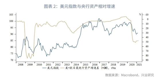 货币政策方面,3月末美联储主席鲍威尔在国会听证会上再次释放Taper信号,他表示随着经济复苏(出现实质性进展)将逐渐缩减资产购买。从美国目前的经济重启和疫苗接种进程看,年内美联储可能会更加频繁的向市场传递Taper信号,进而继续推动美债收益率和美元指数上行。值得注意的是,美联储与其他发达经济体央行的资产相对增速已经出现拐点,给予美元支撑。另外,美债收益率持续反弹后进入配置区间,资金开始回流美国,也有助于美元指数企稳反弹。