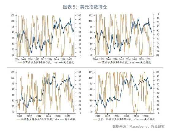 我们在2020年第四季度末判断:2021年第一季度美元指数将继续弱势寻底,但可能出现情绪扰动触发美元阶段性反弹。美元指数的持仓分化已经出现酝酿反转的征兆,中期不宜过分看空美元。事实上,美元指数如期在第一季度完成筑底并在3月显著走强,月末突破93关口,非美货币则不同程度承压贬值。