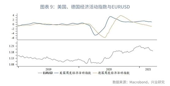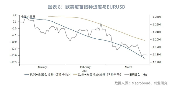 美国除西海岸已基本完成经济重启,今年第二季度有望实现群体免疫。与此形成鲜明对比的是欧元区加强封锁、疫苗接种迟缓。在重新加强封锁后,德国经济复苏动能已经显著下降。美强欧弱的基本面凸显,货币政策倾向也出现了“美鹰欧鸽”的分化,美联储再提Taper,而欧央行3月议息会议则宣布将加速PEPP购债。此外,美债收益率上行带动欧元区经济体收益率上行,以及此前欧元有效汇率持续升值,使得金融条件与基本面并不匹配,这也将促使欧央行进一步加码宽松。