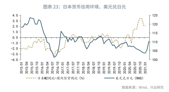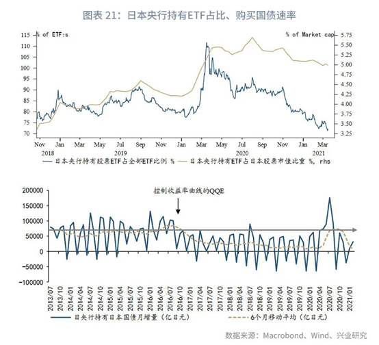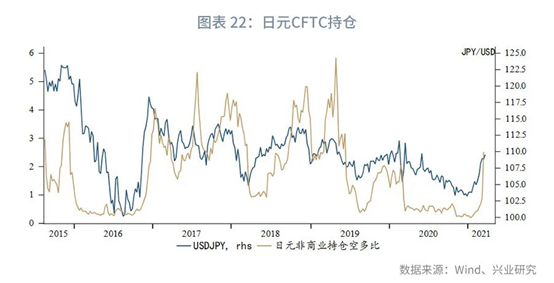 从日本央行的实际资产购买情况来看,2020年第二和第三季度出现“天量”国债购买后,日本央行迅速收缩国债购买规模至疫情前水平,而日本央行持有的股票ETF市值占股票总市值比重也从巅峰5.6%水平收缩到5%附近。然而相比较疫情前约4.3%的水平仍有较大提高,未来还有进一步下降空间。总而言之,目前日本央行QE规模基本回到疫情前“正常”水平,倘若未来美债收益率上行速率超出预期,不排除日本央行进一步扩大长端目标利率波动区间的可能,但未有实质性加息举措前,日元难以趋势性转向。