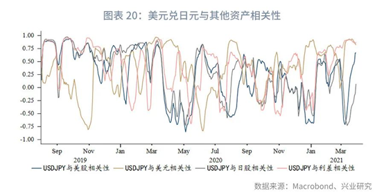 3月日元呈现持续贬值态势,符合我们的预期。3月中旬多空双方在109附近有所胶着,随后顺利突破阻力关口并向111进发。从相关资产关联来看,美元兑日元与美元和利差的相关性保持高位,与美股和日股的相关性先降后升。