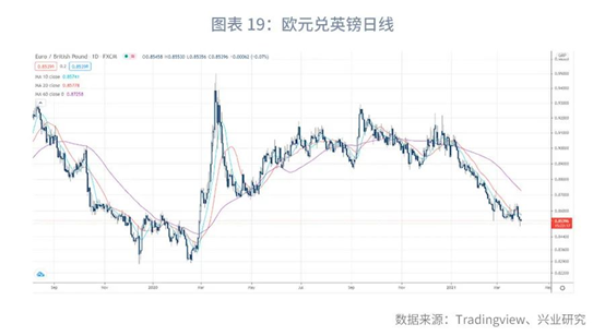 第一季度欧元兑美元自1.23上方高位大幅回落至1.18下方。核心欧元区再度加强封锁、疫苗接种迟缓、欧央行加码宽松均是打压欧元的重要因素。展望2021年第二季度,美强欧弱的格局暂时不会改变,欧元或继续承压。